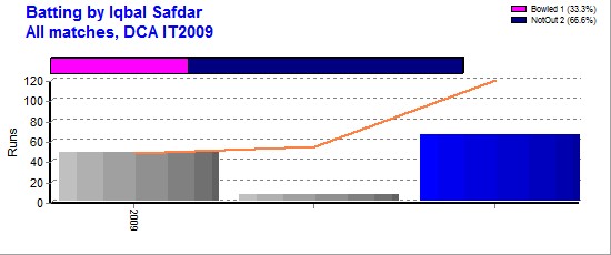 | DCA IT2009 | 3 | 3 | 2 | 120 | 66* | 120.00 | - | 1 | 12 | - | 92 | 2 | 46.00 | 1-23 | - | - | - | - | 1 |