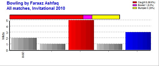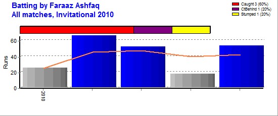 | Invitational 2010 | 5 | 5 | - | 213 | 66 | 42.60 | - | 3 | 16 | 1 | 100 | 12 | 8.33 | 5-29 | - | 1 | 2 | - | 1 |