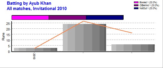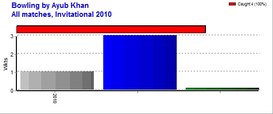 | Invitational 2010 | 3 | 3 | 1 | 33 | 24* | 16.50 | - | - | 10 | 1 | 69 | 4 | 17.25 | 3-18 | - | - | 2 | - | - |